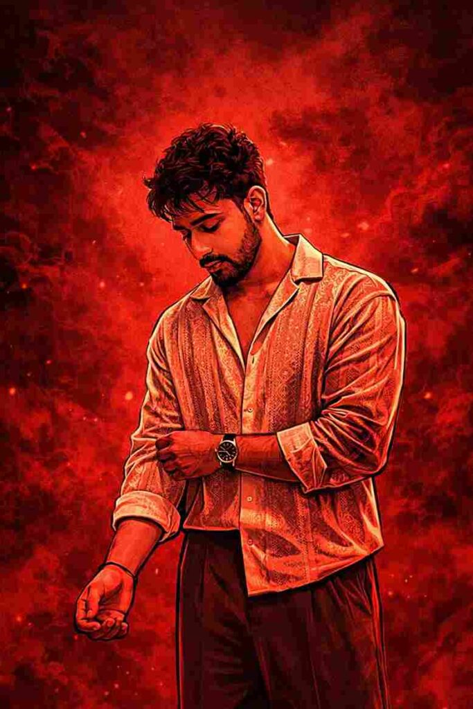 Create a cinematic digital illustration while maintaining the exact face identity, hairstyle, expression, skin tone, and pose with zero distortion. Transform the scene into a deep red, high-contrast Tamil gangster movie poster style. Replace the background with red gradients, smoky atmosphere, and subtle textures. Add bold comic-style shading, thick outlines, strong black shadows, and glossy highlights on skin and clothing. Enhance jawline, cheekbones, and body edges with intense highlights. Keep the original pose and attitude. Create a gritty, powerful cinematic mood with dramatic lighting, ultra-detailed sharp lines, and 4K-quality illustration.